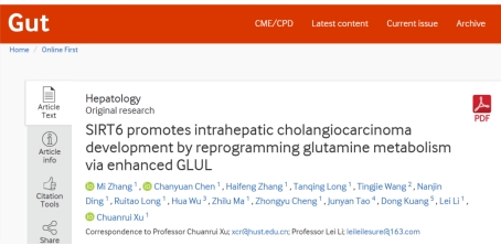 近日,药学院徐传瑞教授团队在Gut杂志在线发表了题为SIRT6 Promotes Intrahepatic Cholangiocarcinoma Development by Reprogramming Glutamine Metabolism via Enhanced GLUL的研究论文。该研究揭示了SIRT6通过调控GLUL的表达重编程谷氨酰胺代谢,并确定了SIRT6-GLUL轴可作为肝内胆管癌的潜在治疗靶点。