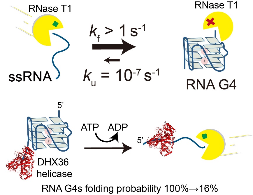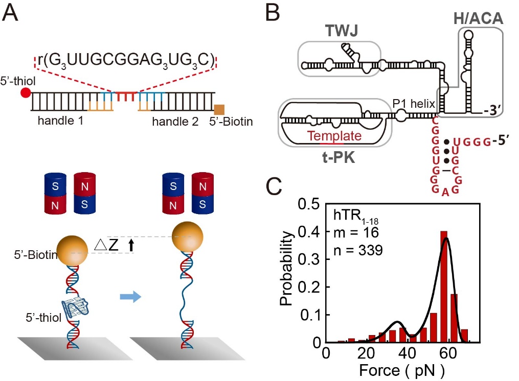 端粒酶是真核生物中维持染色体末端长度的一个关键核糖核蛋白复合物,其活性与细胞衰老及肿瘤发生密切相关。端粒酶的RNA亚基(hTR)不仅是其催化活性所必需的骨架,其本身也蕴含着调控的“开关”。hTR的5' 端存在一段18个核苷酸的富含鸟嘌呤的序列(hTR1-18),它能够折叠形成G-四链体(G-quadruplex,G4)结构。该结构已被证明会影响端粒酶P1螺旋的形成,从而调控端粒合成的模板边界。已有研究根据NMR结果推测出hTR1-18G4是带有凸起的平行构象,且生化实验结果提示其具有较高的热稳定性,但关于它在生理条件下的动力学稳定性(即其折叠/去折叠的速率)、这种稳定性带来的抵抗核酸酶降解的能力,以及细胞如何调控如此稳定的结构,仍然缺乏系统的定量研究。