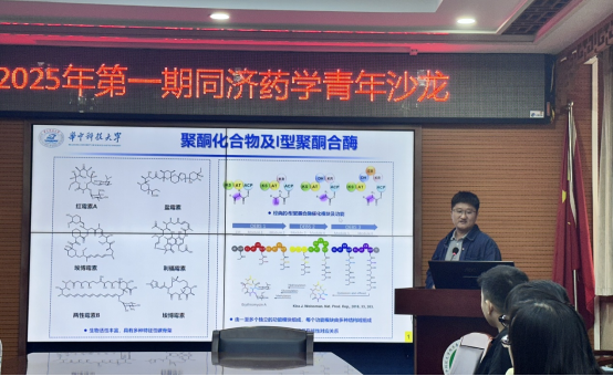 翟贵发老师以“阿扎霉素F生物合成中的非线性催化机制”为题报告了阿扎霉素F分子在微生物体内的合成路径,首次揭示了一种突破传统线性生物合成途径认知的非线性催化机制,阐明合成过程中关键酶如何通过复杂而高效的协同催化,精准构筑阿扎霉素F的复杂分子骨架。
