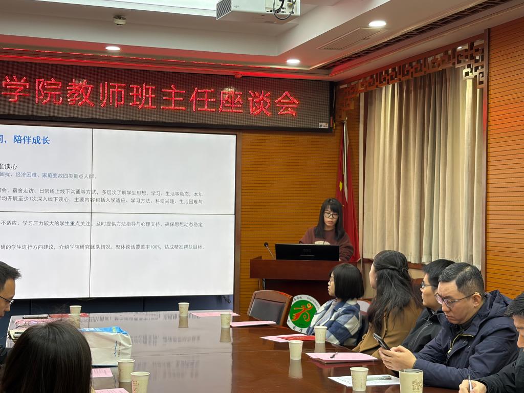 为深入总结教师班主任工作经验,系统推广育人优秀实践,进一步提升班主任队伍专业化水平与育人实效,构建“全员、全过程、全方位”育人新格局,药学院于2025年12月10日召开2025年教师班主任工作总结交流会。药学院党委书记黄锐、党委副书记李进出席会议,全体教师班主任及专职辅导员参会,会议由党委副书记李进主持。