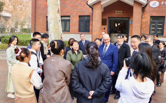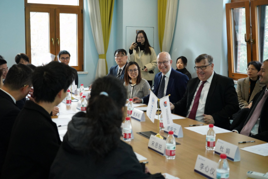 在中外合作办学项目办公室所在地明诚楼前,校党委书记刘波与魏磊大使主动走近项目学生,询问大家入校以来学习生活适应情况、课程设置感受及未来发展规划。面对提问,同学们用英语流利应答,分享自身体验,展现出扎实的语言功底、良好的精神风貌和开阔的思维视野,赢得在场人员一致赞赏。